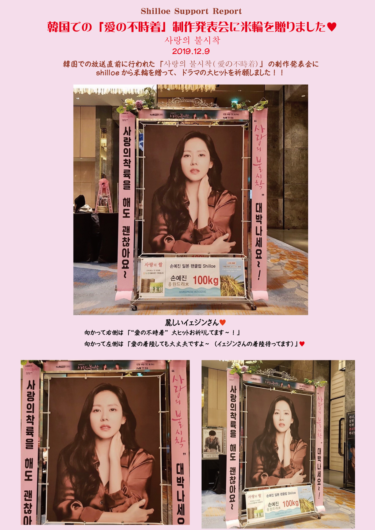 - ★Topics!にshilloeのサポート活動などを少し前のものも含めて追加しました(遅くなりました!)。「イェジンさんへのバースデープレゼント」「愛の不時着展へのお花」「愛の不時着制作発表会への米輪」(←米輪は「愛の不時着撮影時の差し入れ」の下に掲載)