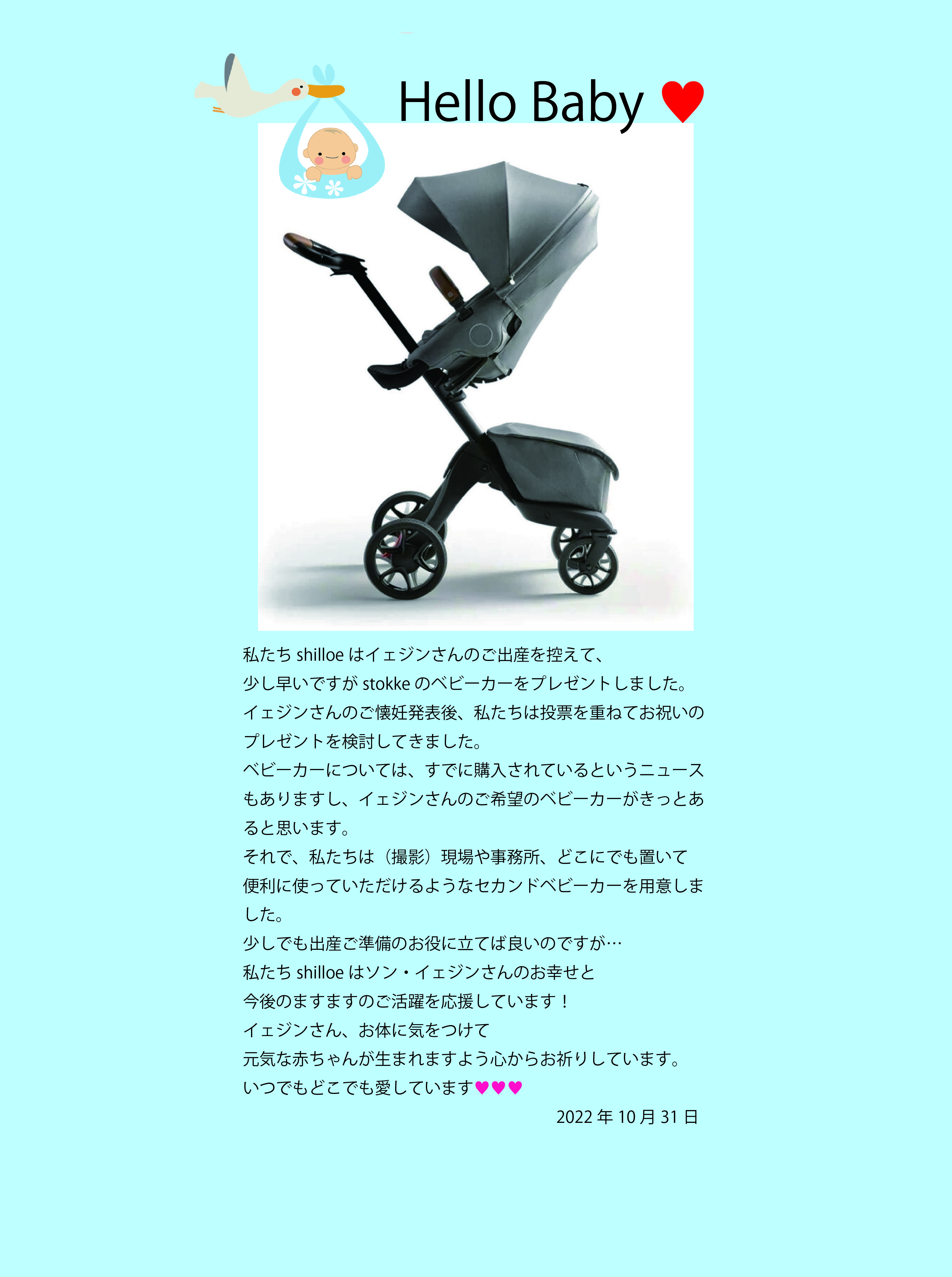 2022年10月31日ご出産前のイェジンさんに贈りものをしました。