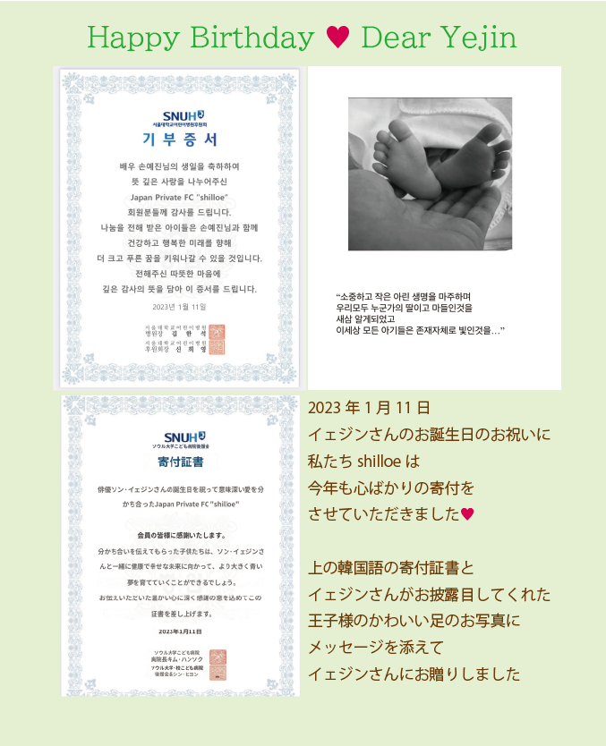 - ★ものすごく久しぶりの更新で申し訳ありません!Topics!に昨年おこないましたイェジンさんへのご出産前の贈り物(2022.10.31)、今年のイェジンさんへのお誕生日の贈り物について追加しました。その前後におこなったshilloeの活動については、今後、掲載していきます!
