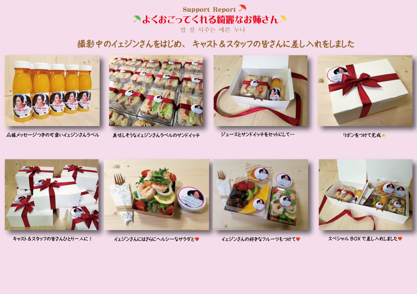 JTBCドラマ「よくおごってくれる綺麗なお姉さん」撮影中のイェジンさんとスタッフの皆さんに、ジュース&サンドイッチなどの軽食を差し入れました。